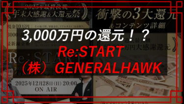 今回は【株式会社GENERALHAWK(ジェネラルホーク)】が提供する【Re:START(リスタート)】について注意喚起させてもらう。 結論 稼げない可能性大 特に、今後購入を検討している、またはサービスを利用・購入したという方は是非参[…]
